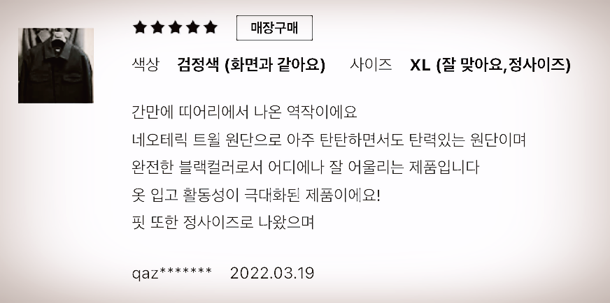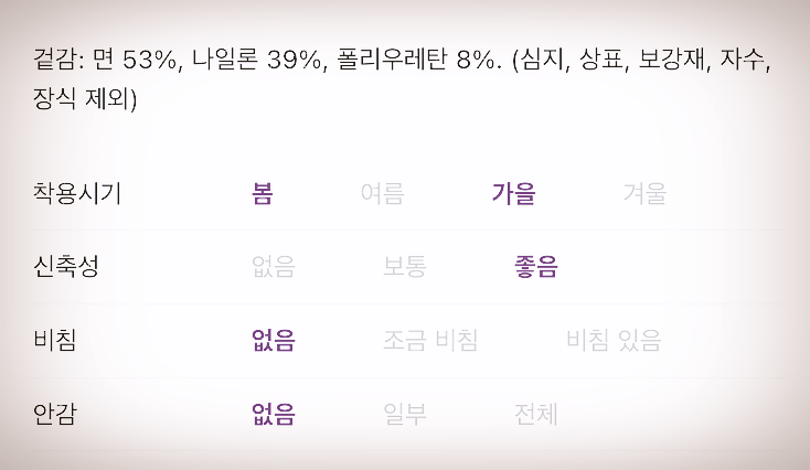 역시 해당 제품은 SS 제품답게 봄이나 가을에 적합한 제품인데요, SSF몰에서도 봄이나 가을에 착용을 추천하고 있습니다. 다만, 두께감이 좀 있어서 좀 크게 입고, 레이어링을 한다면 좀 추운 늦은 가을이나 초봄에도 착용할 수 있을 것 같습니다.