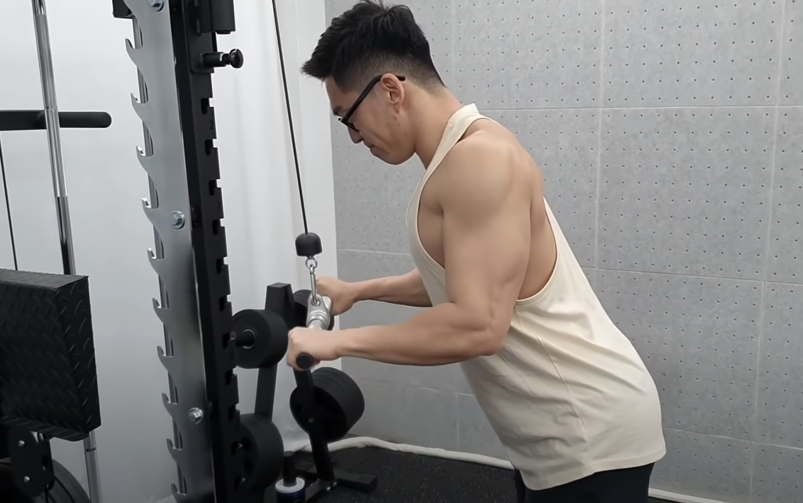 - 삼두 : 케이블 푸쉬다운(12-15회 상대적으로 가벼운 무게로 진행)