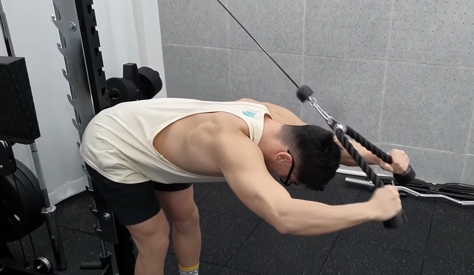 - 삼두 : 로프 오버헤드 익스텐션(12-15회 상대적으로 가벼운 무게로 진행)