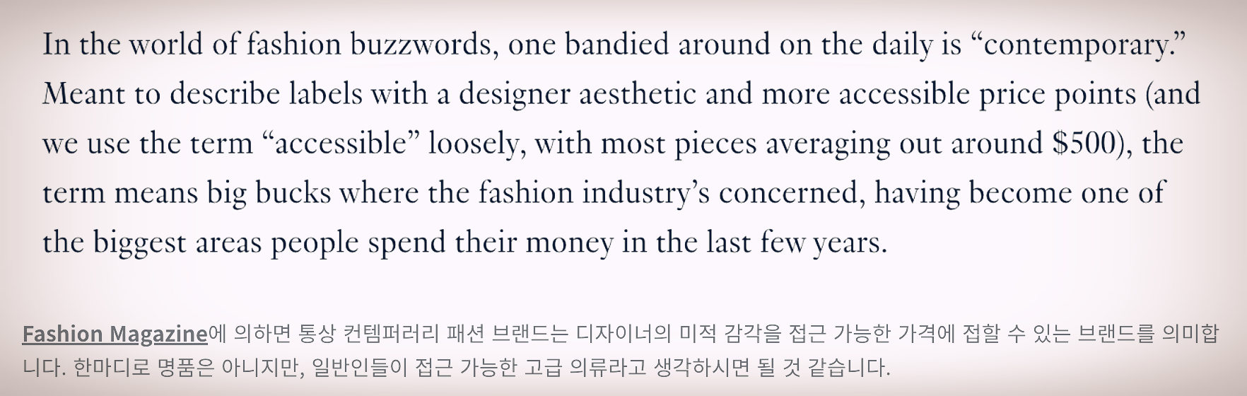 - 컨템퍼러리 패션 브랜드는 디자이너의 미적 감각을 접근 가능한 가격에 접할 수 있는 브랜드를 의미합니다. 한마디로 명품은 아니지만, 일반인들이 접근 가능한 고급 의류라고 생각하시면 될 것 같습니다.
